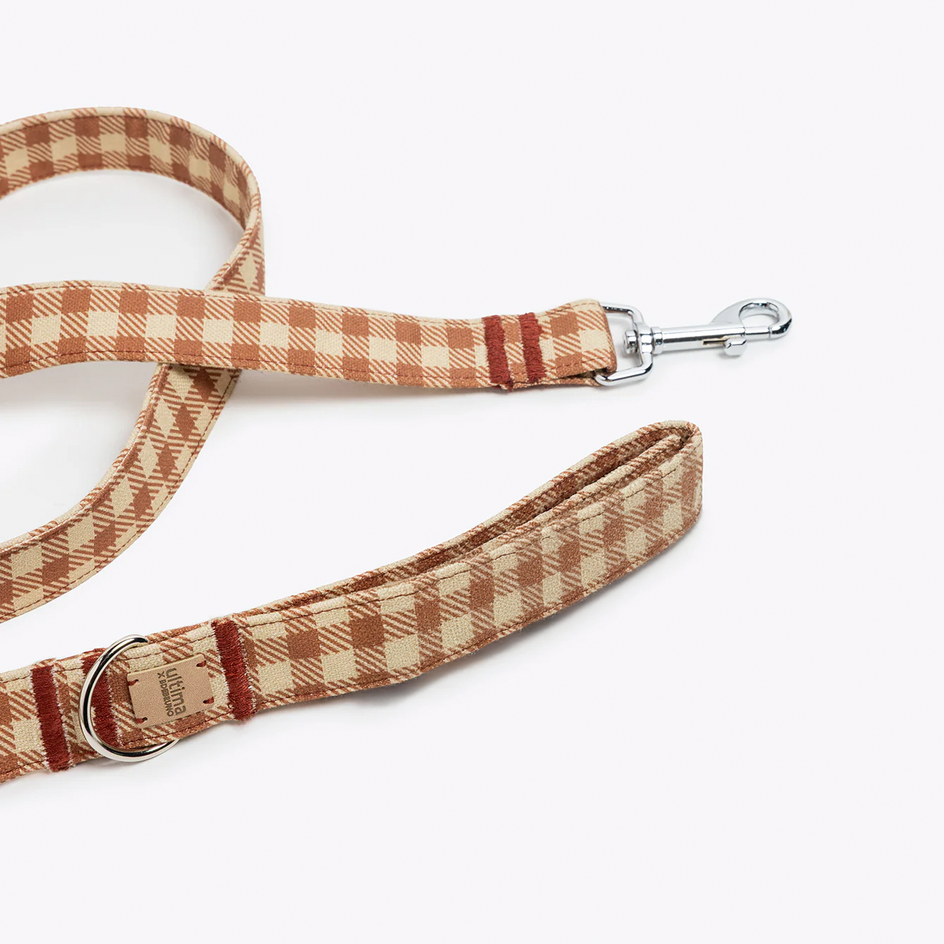 Fabriquée à la main en Espagne, en ruban de nylon recouvert d'un tissu en coton biologique certifié Oeko-Tex Standard 100, doux et agréable, avec un imprimé vichy, notre laisse sera votre alliée lors de toutes vos promenades.